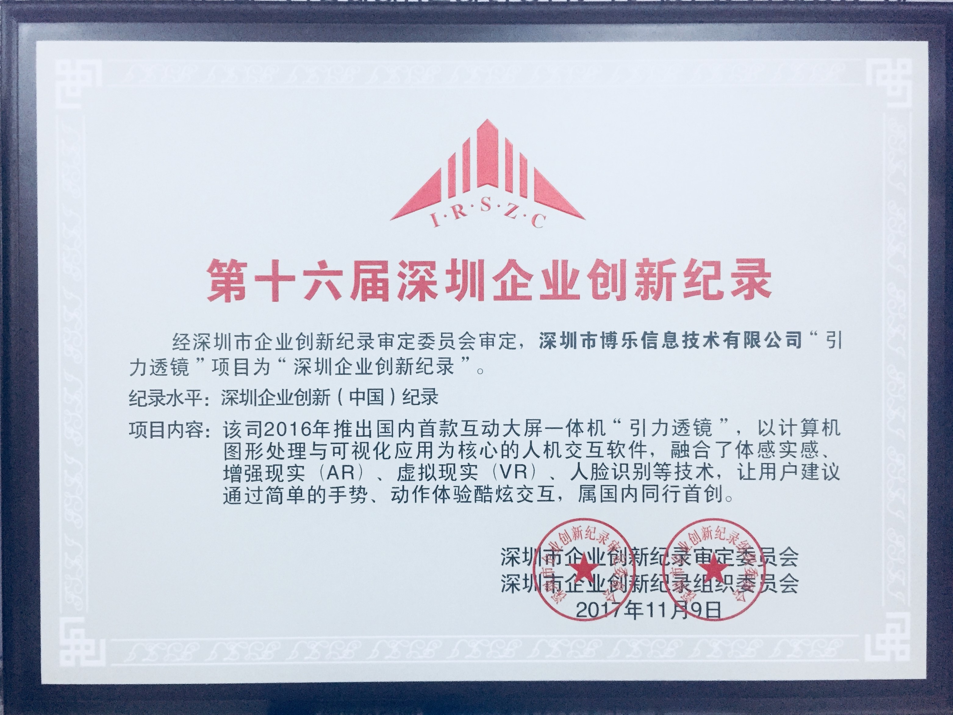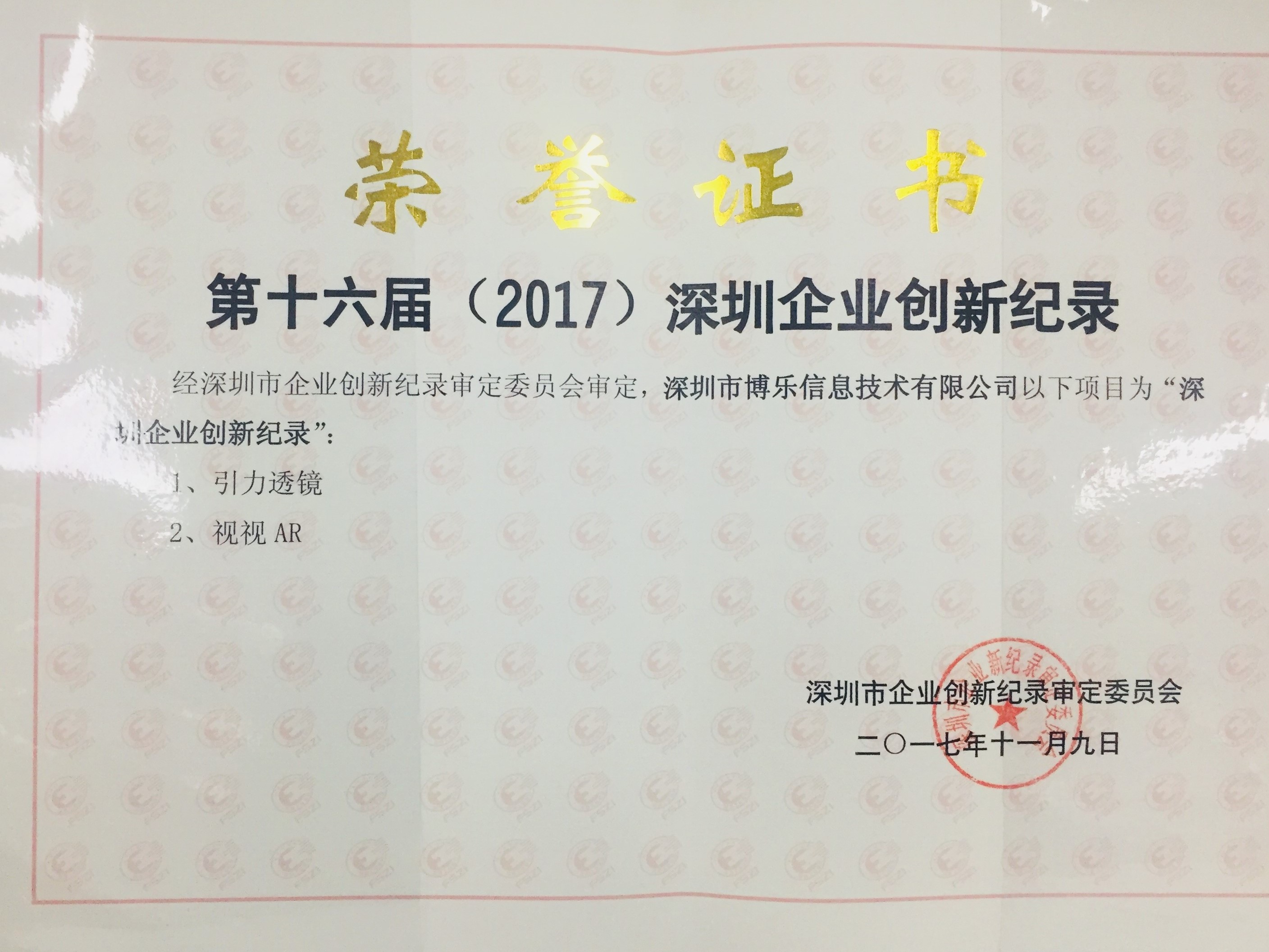 1月12日,由由深圳工总具体组织、13个政府部门、57家行业协会共同参与专业评审的“第十六届深圳企业创新纪录”重磅出炉,深圳市博乐信息技术有限公司的引力透镜和视视AR两大项目实力获奖。