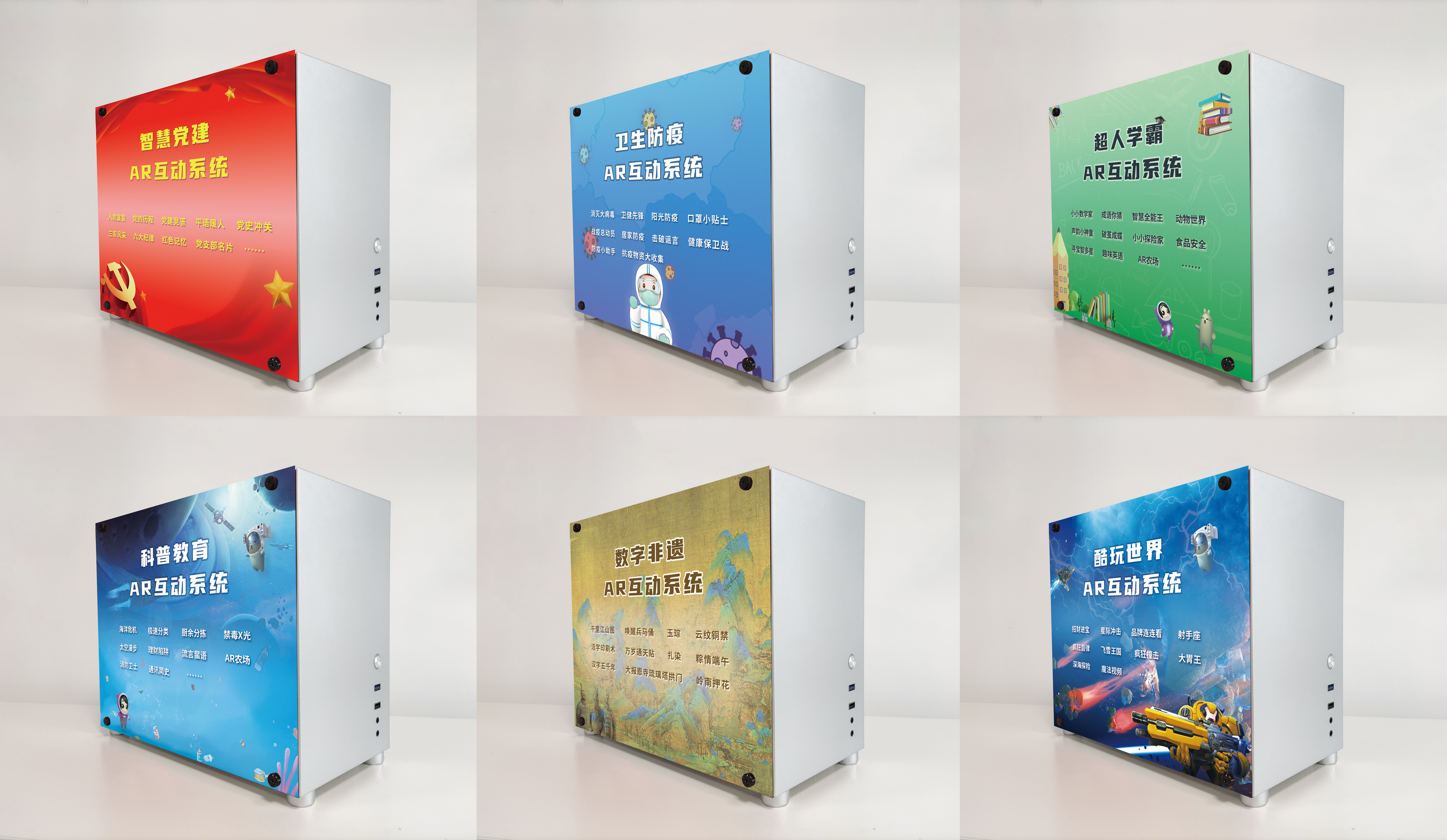 作为国内最早一批加入AR/VR领域的企业,公司致力于提供集AR/VR互动、手机AR营销、虚拟直播、虚拟抠像为一体的互动营销综合解决方案,打造了集软硬件为一体智慧AR互动系统,包括智慧党建、科普教育、数字非遗、卫生防疫、超人学霸、酷玩世界6大产品体系数百款AR互动内容。可广泛适用于LED屏、电视屏、智慧屏、户外广告屏等显示设备。六大系列均以系统主机硬件+互动内容软件一体化的方式销售,2天就能完成交付,用户只需连接显示设备即可使用,方便快捷,适用于数字党建、防疫科普、文旅景区、科普研学等场景。