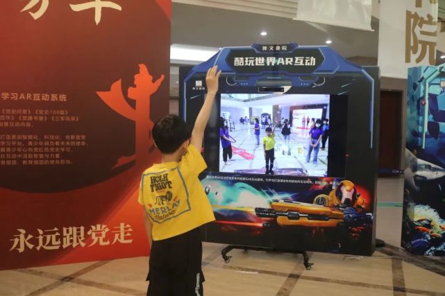 智慧党建AR互动,汇聚视频、文字、图片等各类党的经典内容,以单\多人体感答题或互动浏览等方式帮助学生学习党史知识,感受党的发展历程;