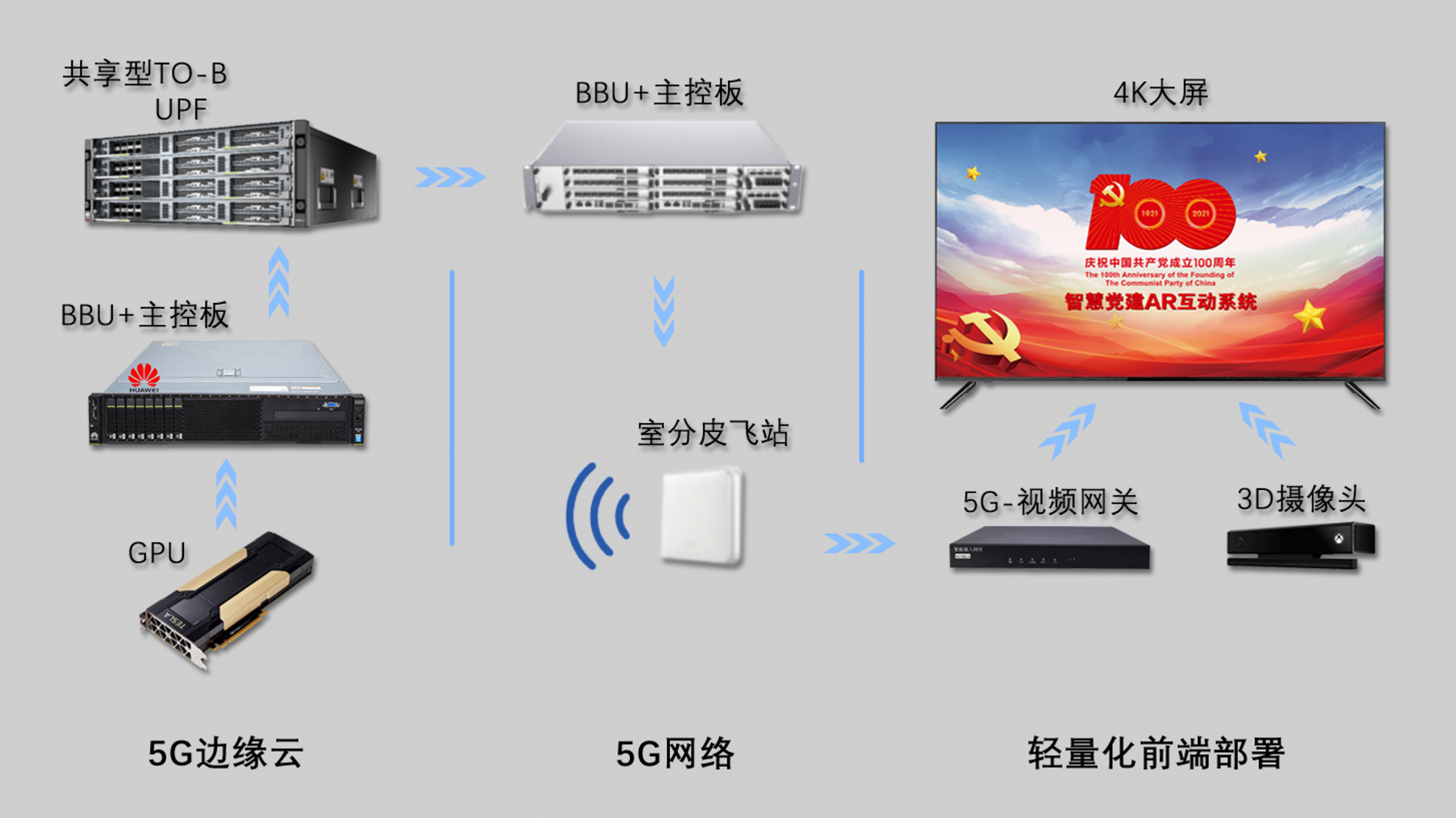 《基于5G-MEC边缘计算的前端轻量化AR党建解决方案》基于博乐信息自主研发的智慧党建AR互动系统,利用5G网络超大上行能力+边缘云低时延特性,轻量化前端设计,只保留了3D体感摄像头及具有视频、图形处理能力的5G智能AI网关,连接4K高清大屏,实现AR智慧党建系统在5G网络边缘节点快速部署。