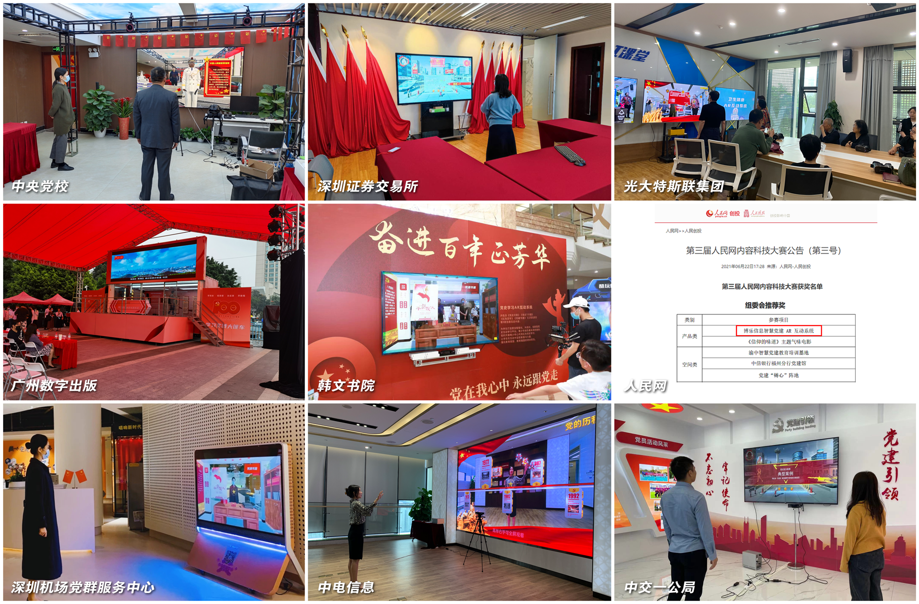 5G-MEC+AR党建系列产品自2019年在深圳机场党群服务中心试点推广以来,获得福田区工信局及深圳信通院的认可与支持,目前已落地全国14省份21城市,获中央党校联合推荐、第三届人民网内容科技大赛组委会推荐奖;深交所、深国际、中电信息、中交一公局、光大特斯联、广州数字出版等企事业单位党建信息化升级选择产品;韩文书院、林芝二小、深圳福田外国语学校、广州黄埔区新港小学等青少年党史互动课程使用产品。打造数字化党建党史学习,以更加智能化、创新化、互动化形式推广红色文化,让党史学习起来。
