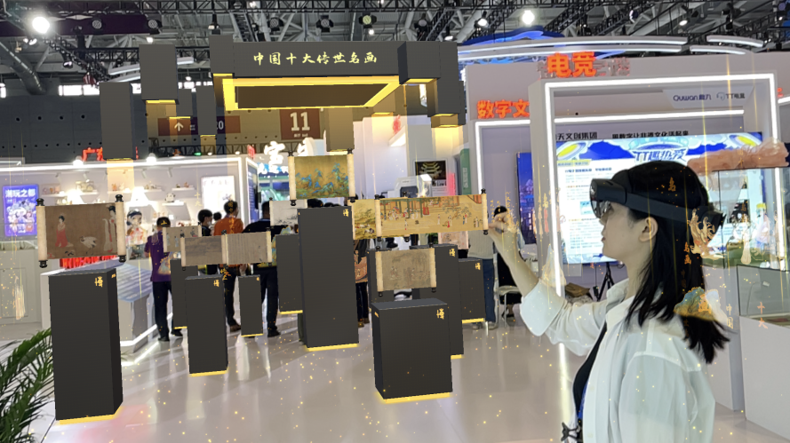 将博物馆搬进“元宇宙”,打造别样的逛展体验。在博乐信息MR视觉交互专区,“广州赋”和“中国十大传世名画”以数字长卷的方式在元宇宙空间中徐徐展开,更是运用数字科技实现了受损传世国宝的数字“合璧”复原。再现中国千年墨香古韵和丹青之境,打破观众与文物有限的接触边界,真正实现了让“文物活起来”。