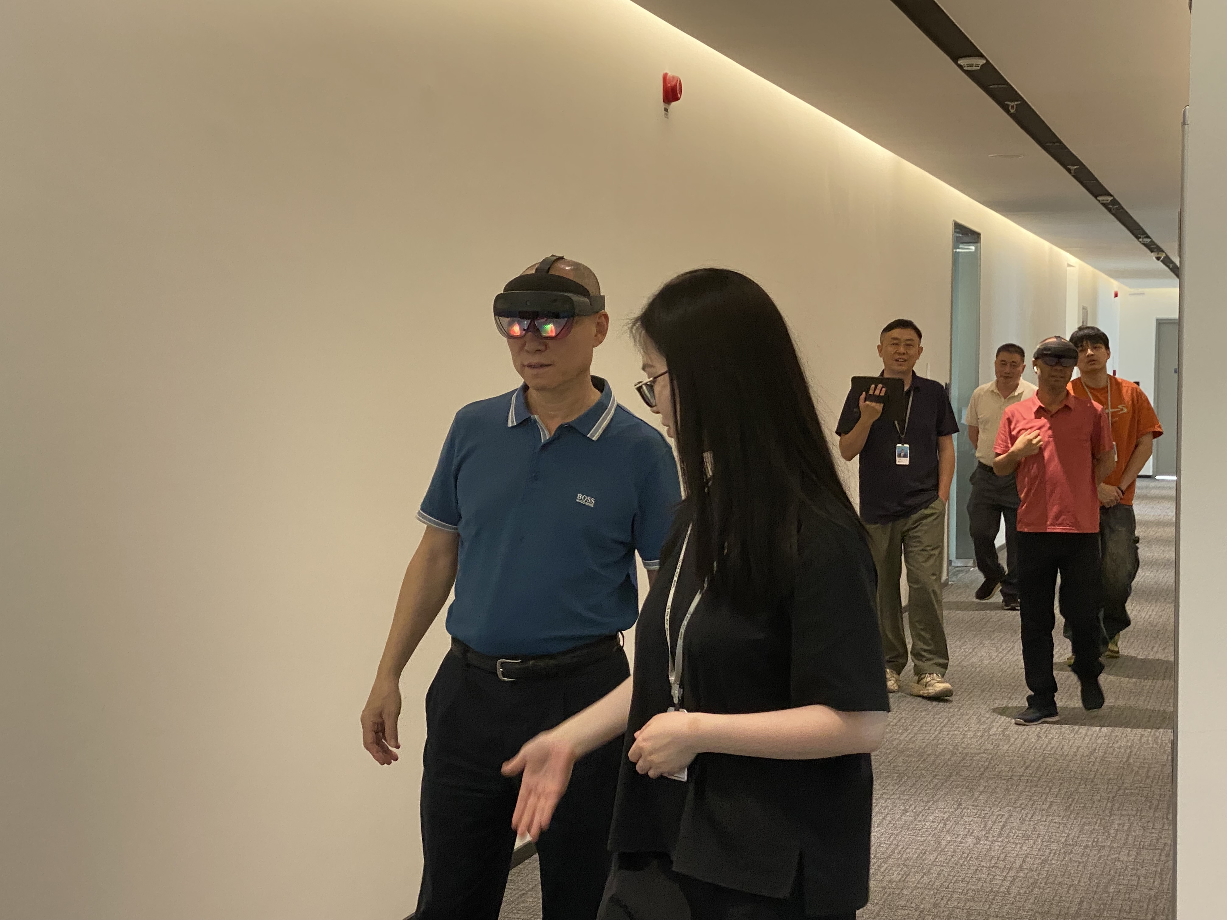 在博乐信息展厅,赵会长一行通过MR设备,感受虚实场景的无缝融合,并穿梭了元宇宙“时空走廊”,对于这种将有限空间转化为无限内容载体、沉浸式探索的方法技术表示认可。